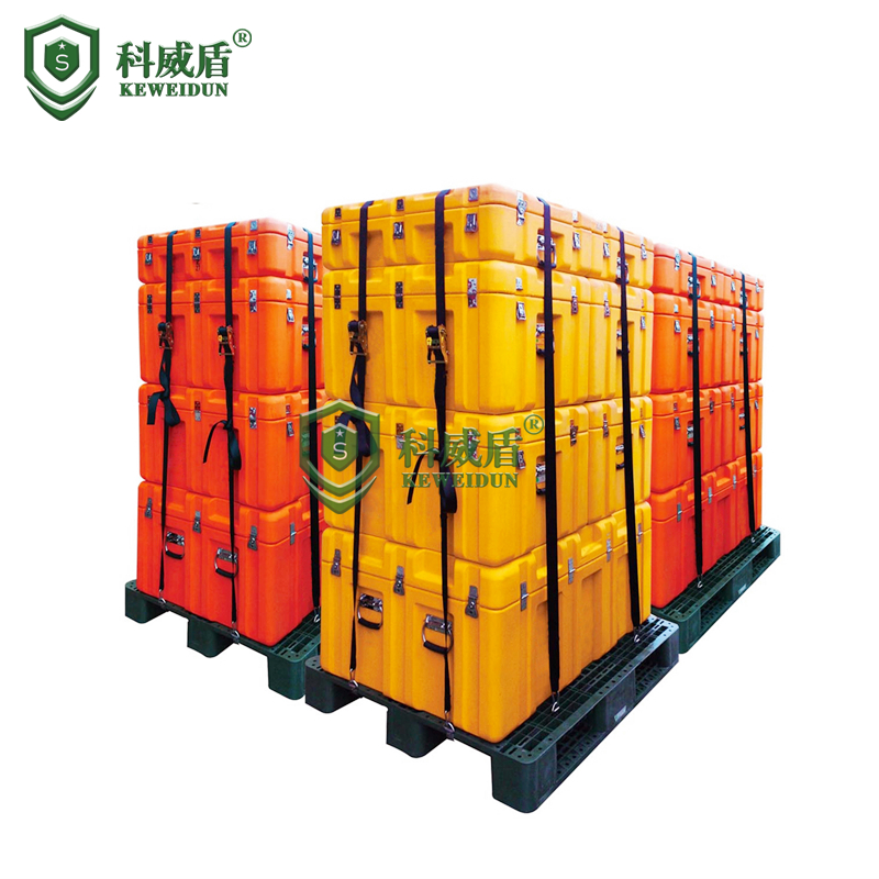 科威盾模塊化物資裝備箱組系列采用滾塑模具成型,可采用任何組合碼垛捆綁于托盤上,由高強度綁帶固定,便于包裝、運輸、儲存應(yīng)急儲運裝備器材。托盤可叉裝、吊裝,承載能力強,便于包裝箱的機械運輸、轉(zhuǎn)運等。